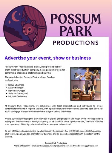 At Possum Park Productions, we create contemporary theatre in regional Victoria, with a passion for performance and a desire to open doors for adults to engage in theatre - whether on the stage or behind the scenes.